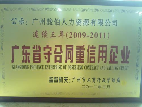 熱烈慶祝廣州駿伯人力資源有限公司公司榮獲“2011年度廣東省‘守合同、重信用’企業(yè)”稱(chēng)號(hào),并連續(xù)三年獲得此榮譽(yù)。